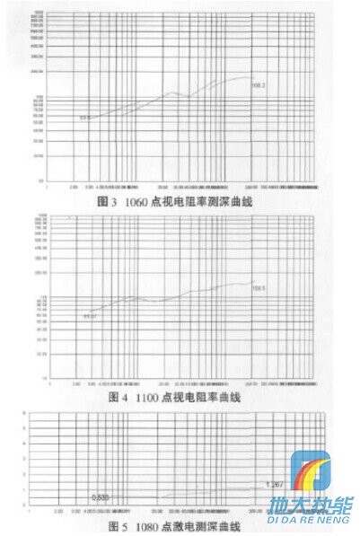 (2)在100線1060、1100點(diǎn)上進(jìn)行電阻率測深, 從二個點(diǎn)的曲線形態(tài)來看,曲線形態(tài)相似且地層分層明顯;70~200m層位穩(wěn)定,基本為砂巖(見圖3~4)。