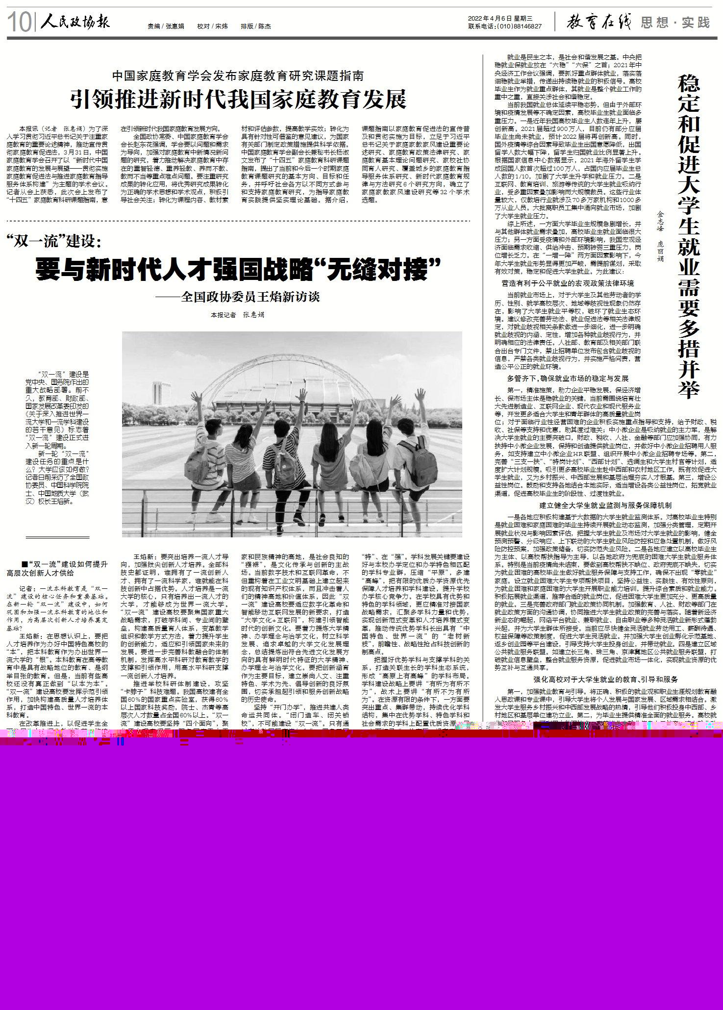 王焰新:要把握好國家戰(zhàn)略與自身發(fā)展的關(guān)系,堅(jiān)持走特色化、創(chuàng)新型發(fā)展道路,讓特色更特,優(yōu)勢更優(yōu)。高校學(xué)科不在多、不在全;而在“特”、在“強(qiáng)”。學(xué)科發(fā)展關(guān)鍵要建設(shè)好與本校辦學(xué)定位和辦學(xué)特色相匹配的學(xué)科專業(yè)群,壓縮“平原”,多建“高峰”,把有限的優(yōu)質(zhì)辦學(xué)資源優(yōu)先保障人才培養(yǎng)和學(xué)科建設(shè),提升學(xué)校辦學(xué)核心競爭力。在學(xué)校具有優(yōu)勢和特色的學(xué)科領(lǐng)域,更應(yīng)精準(zhǔn)對接國家戰(zhàn)略需求,匯聚多學(xué)科力量和優(yōu)勢,實(shí)現(xiàn)創(chuàng)新范式變革和人才培養(yǎng)模式變革,推動傳統(tǒng)優(yōu)勢學(xué)科長出具有“中國特色、世界一流”的“老樹新枝”,前瞻性、戰(zhàn)略性搶占科技創(chuàng)新的制高點(diǎn)。