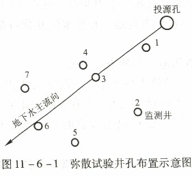 試驗在沿地下水流向上布置的試驗井組[投源井(注入井)及若干觀測井]中進行,見圖11 -6 -1。