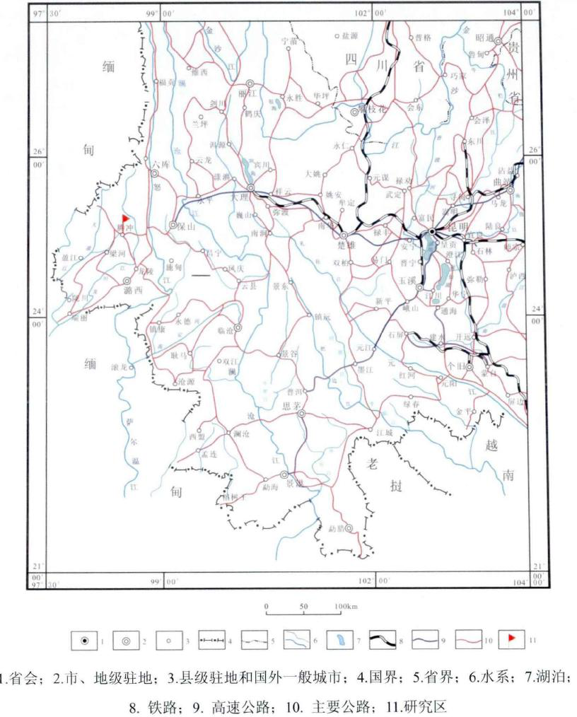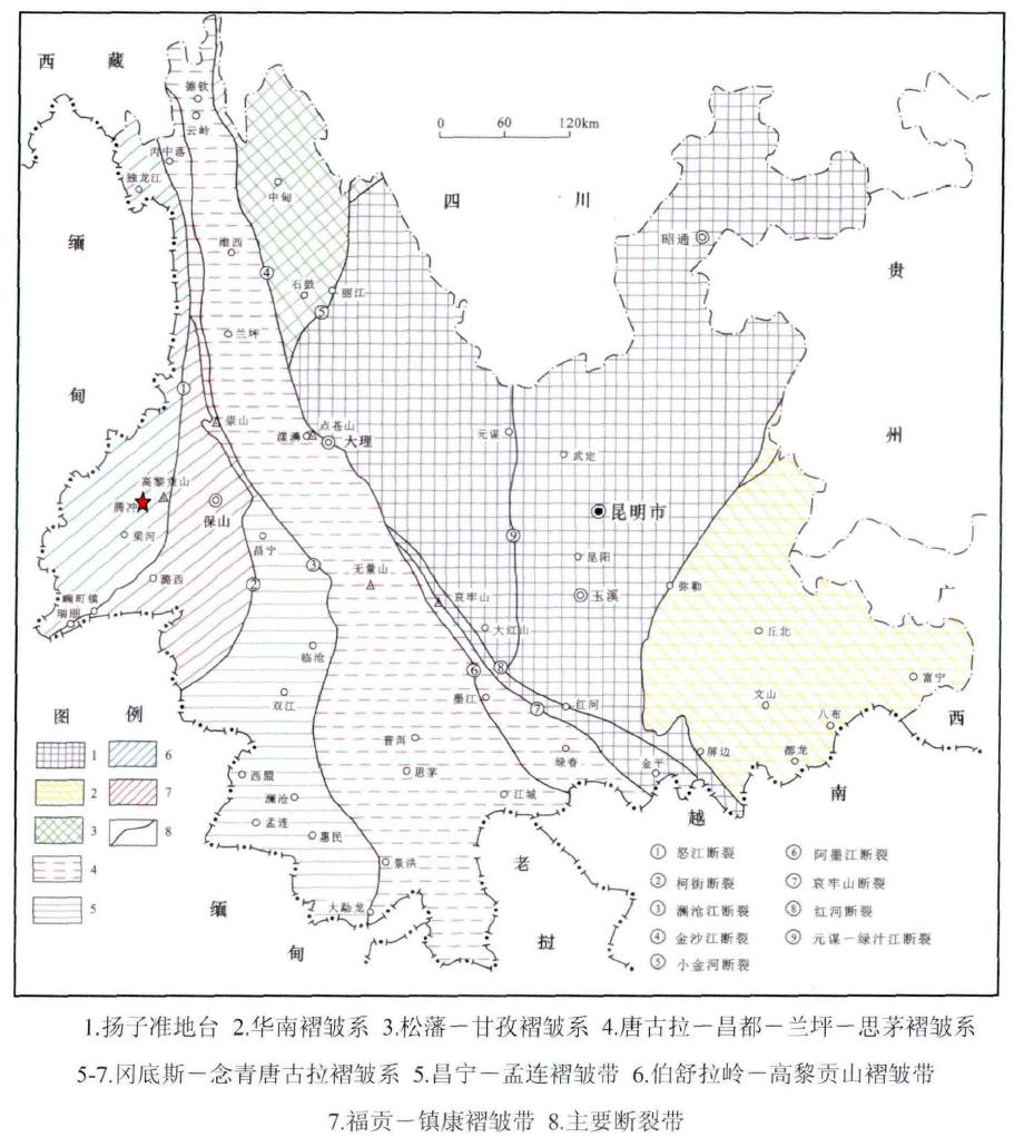 騰沖縣位于高黎貢山西側(cè),總體地勢北高南低,山脈走向?yàn)楸睎|一西向及南北向,與區(qū)域構(gòu)造線基本一致。高黎貢山與怒江并列向南蜿誕,高黎貢山峰脊一線海拔多在3000m以上;而怒江河谷海拔僅500—900m,區(qū)內(nèi)最高峰為高黎貢山中段的大腦子,海拔3780.9m;最低點(diǎn)為盈江縣拉沙河與穆雷江交匯處,海拔僅210m;最大高差達(dá)3570.9m,一般高差在400—2000m之間,屬中高山中一深切割地區(qū)。縣城西側(cè)為高中山地貌景觀,谷深坡陸;東側(cè)為中山山地稍為平緩,但切割密度較大;中部為斷陷谷地,河流階地發(fā)育,地勢平坦開闊。騰沖地區(qū)構(gòu)造運(yùn)動活躍、斷裂構(gòu)造發(fā)育、巖漿活動頻繁、火成巖分布廣泛、新生代火山活動、現(xiàn)代水熱活動異常強(qiáng)烈,溫沸泉眾多。